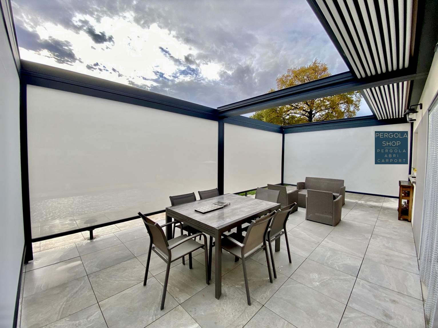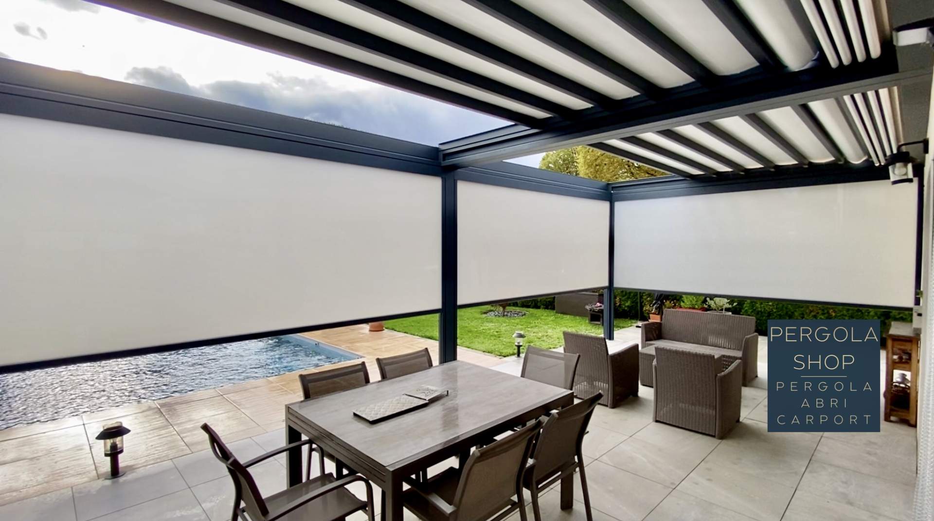 La pergola avec store enrouleur motorisé pour protection solaire.