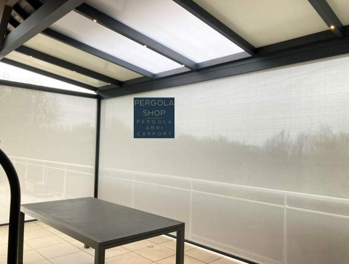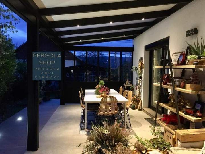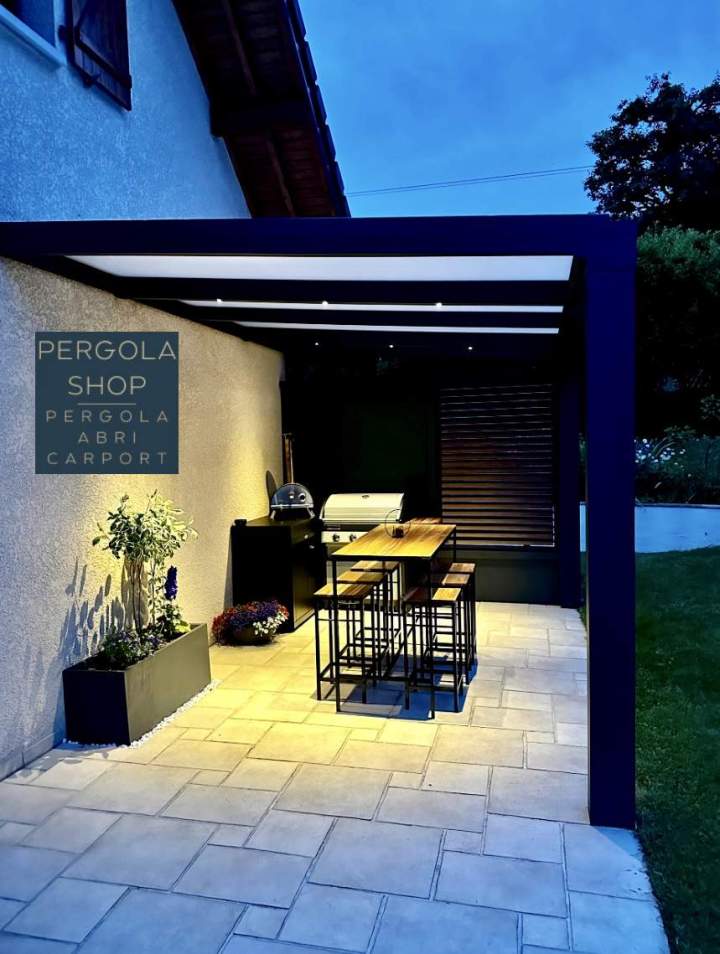 L’intensité des spots LED est variable avec une télécommande. Pour un confort optimal en toute saison, nos pergolas peuvent intégrer en façades, des stores de protection solaire, des claustras, des vitrages panoramiques et des parois pleines.